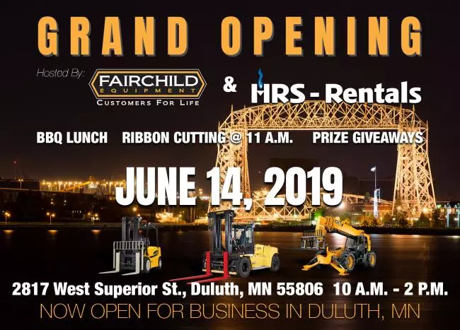 Fairchild Equipment is excited to announce that it will host a grand opening event in celebration of its newest branch in Duluth, MN. The event will be hosted by Fairchild Equipment in conjunction with Heater Rental Service (HRS) on June 14, 2019 at its business location, 2817 W Superior St., Duluth, MN 55806. The Duluth Area Chamber of Commerce will join Fairchild Equipment and hold a ribbon cutting ceremony at 11 a.m. during the event. A BBQ luncheon will be provided to all guests and there will be prize giveaways.